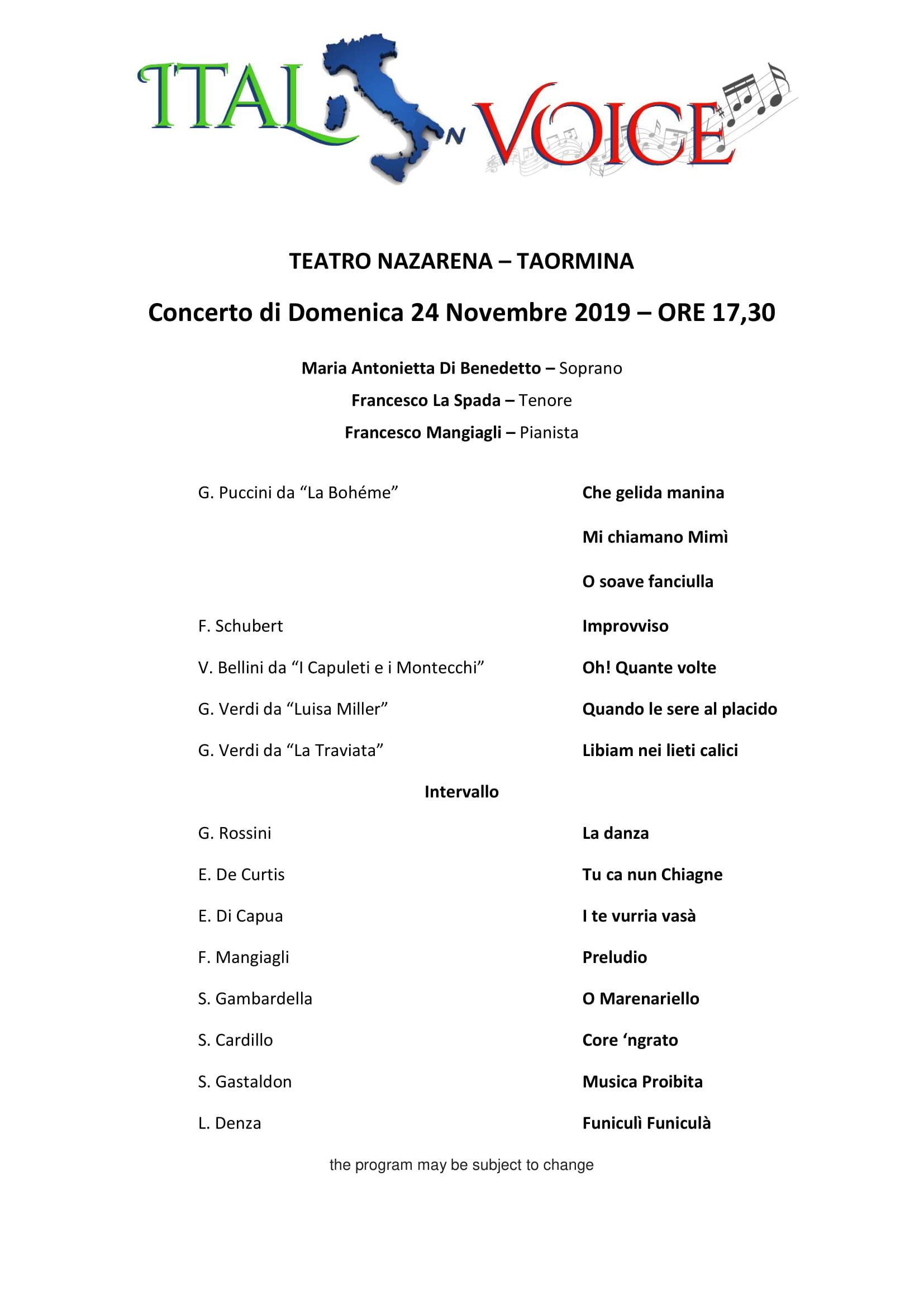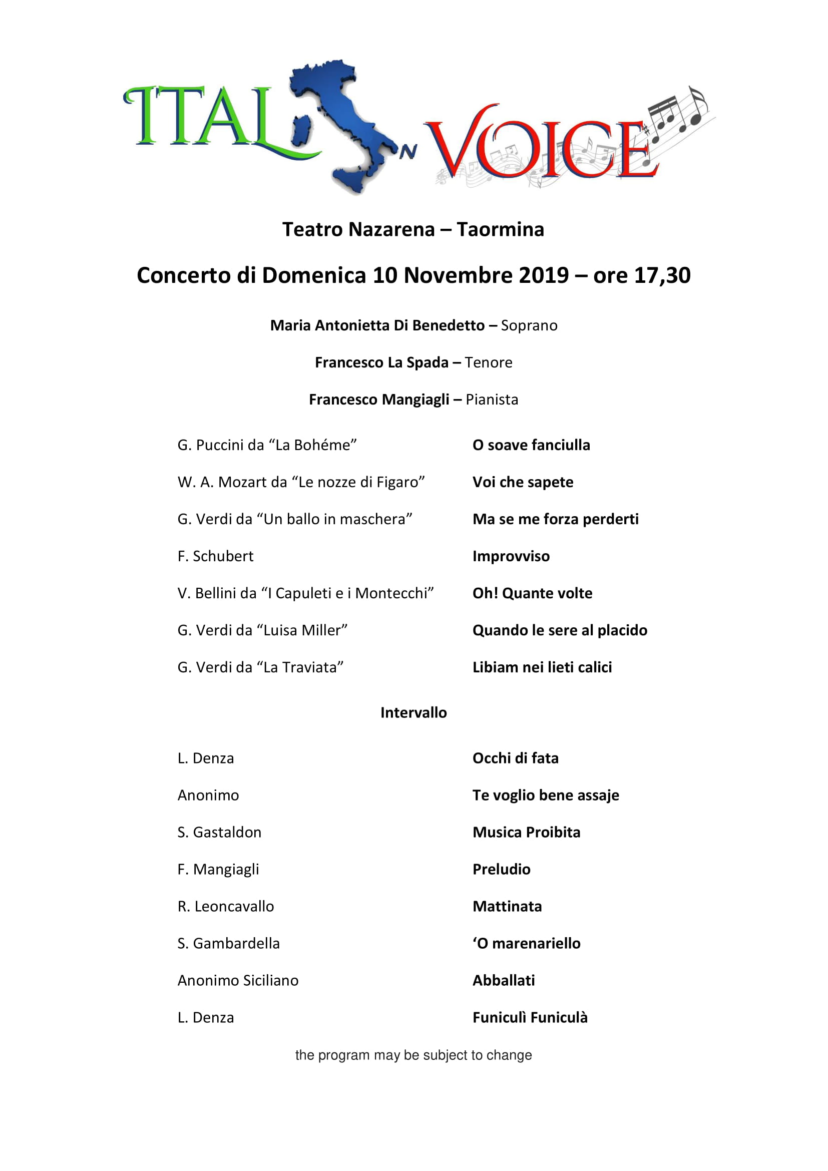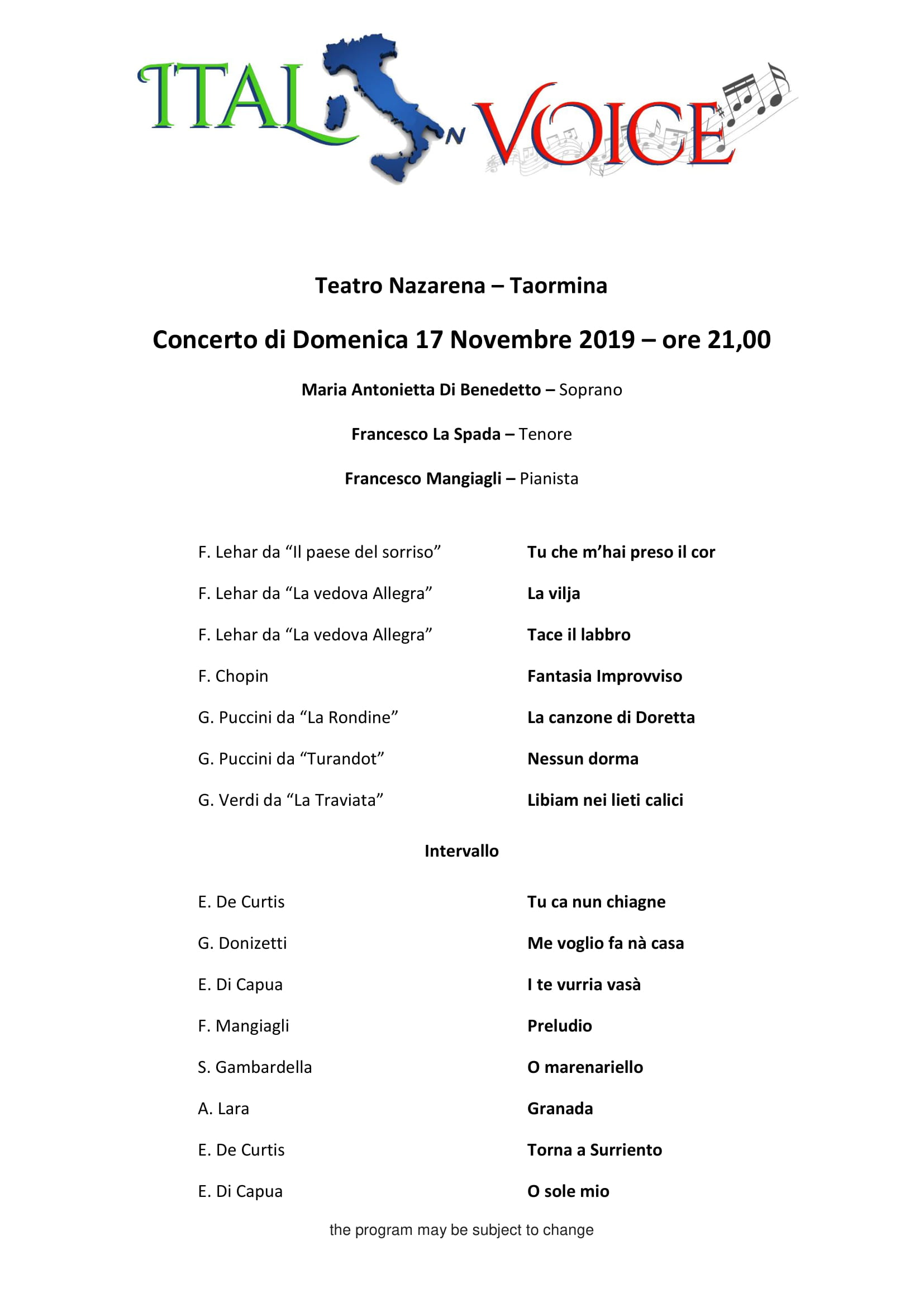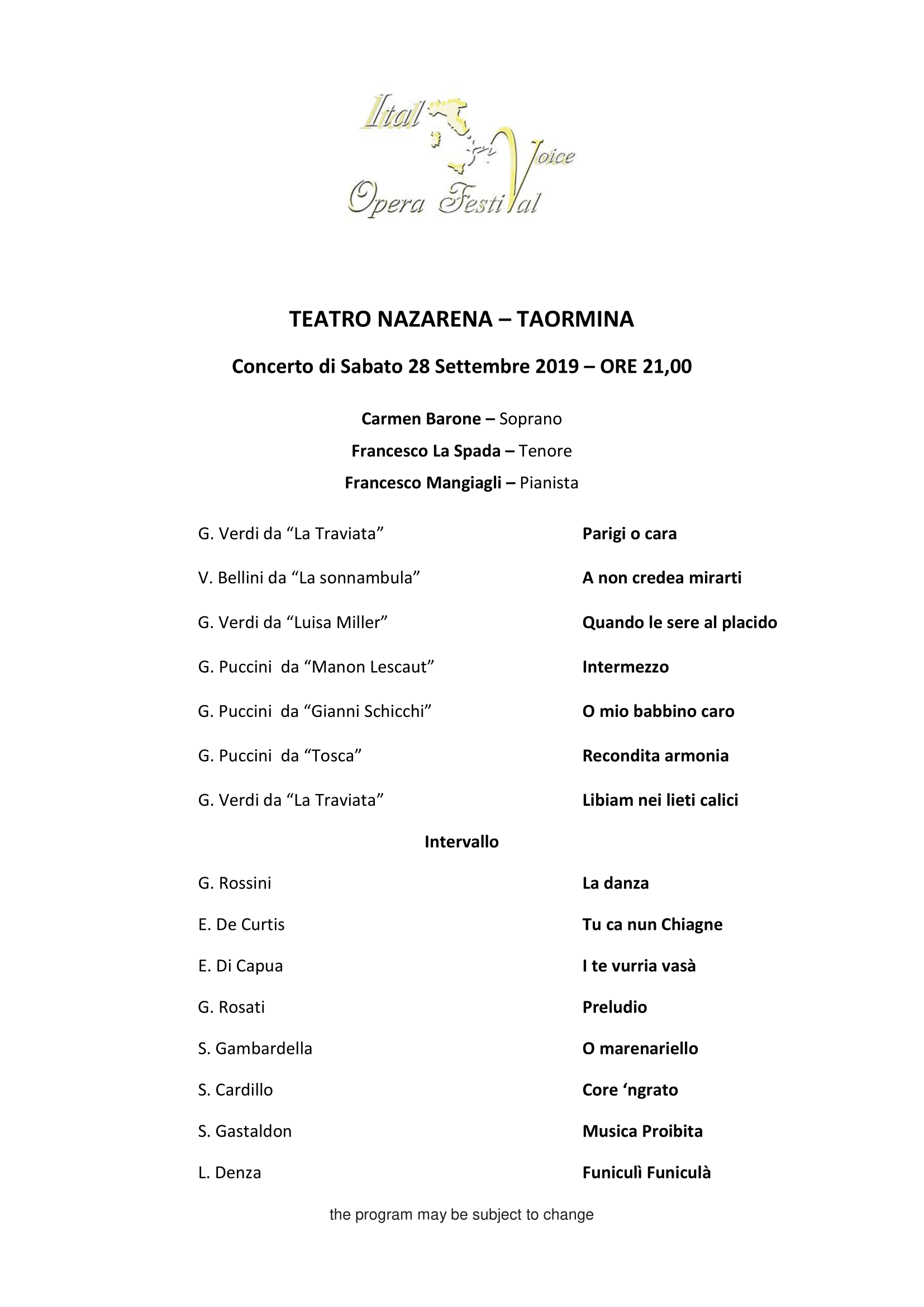 The concert is divided into two parts. In the first part, a selection of arias is proposed, chosen among the most beautiful operas. In the second part will be proposed a selection of the most beautiful songs of Italian, Neapolitan and Sicilian tradition.